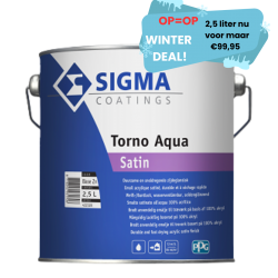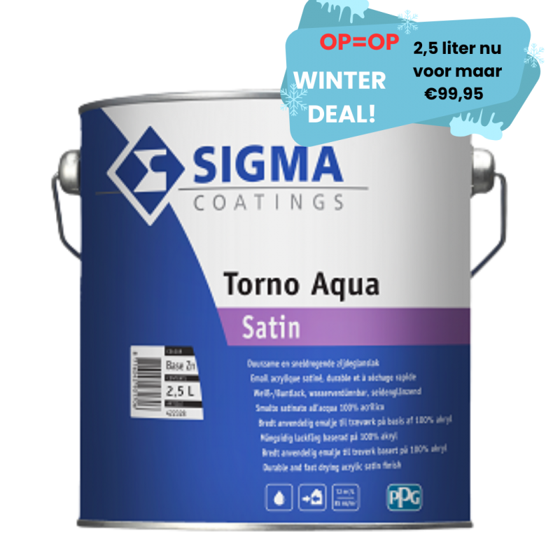 Winteractie! De 2,5 liter Sigma Torno Aqua Satin nu voor slechts €99,95 – exclusief bij Verfspot.nl! Let op: geldt alleen voor wit en lichte kleuren, en op = op!